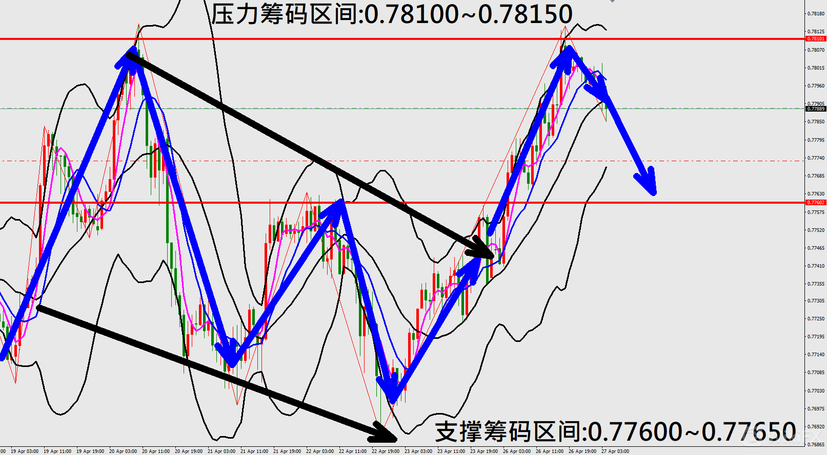 今日澳元/美元(4月27日)早盘在0.77998附近,从技术分析面切入,1小时线级别观察走势架构符合昨日(26日)预测K棒小幅拉回修正后持续反弹上涨,目前K棒拉回落在布林通道中轨与下轨之间,同时开口转折朝下,因此有机会持续向下修正。
