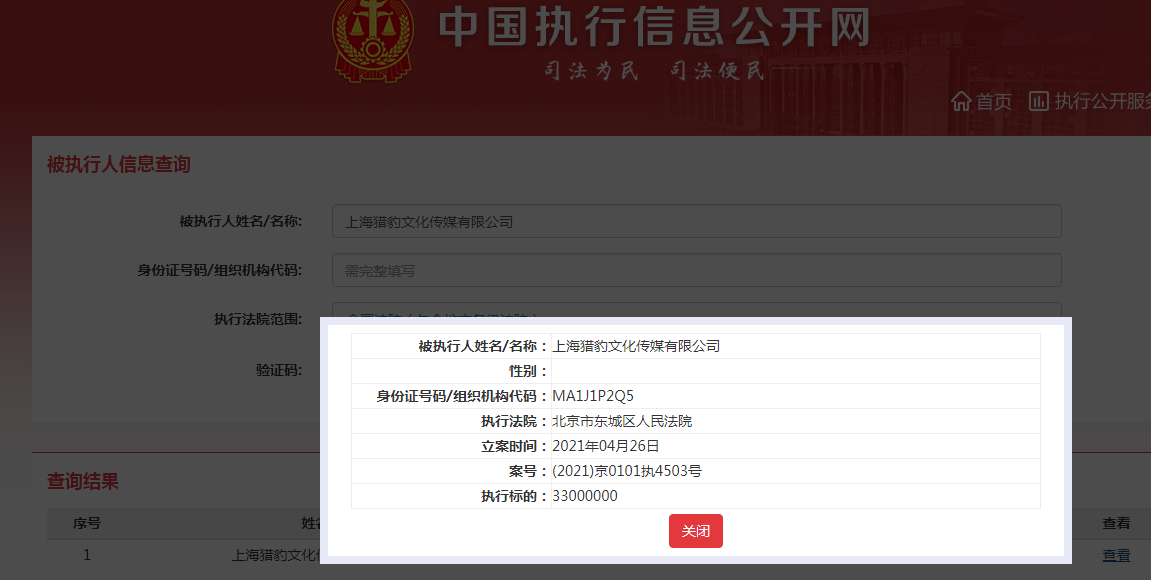 案号(2021)京0101执4503号显示,上海猎豹文化传媒有限公司执行标的3300万元,执行法院为北京市东城区人民法院。