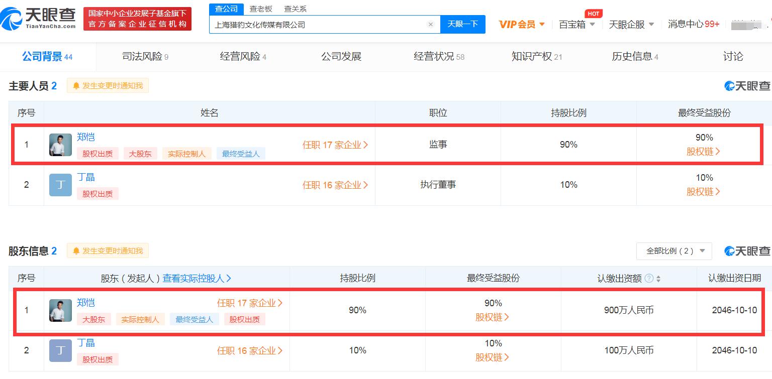 天眼查APP还显示,郑恺为上海猎豹文化传媒有限公司最大股东及最终受益人,持有90%股份。(中新经纬APP)