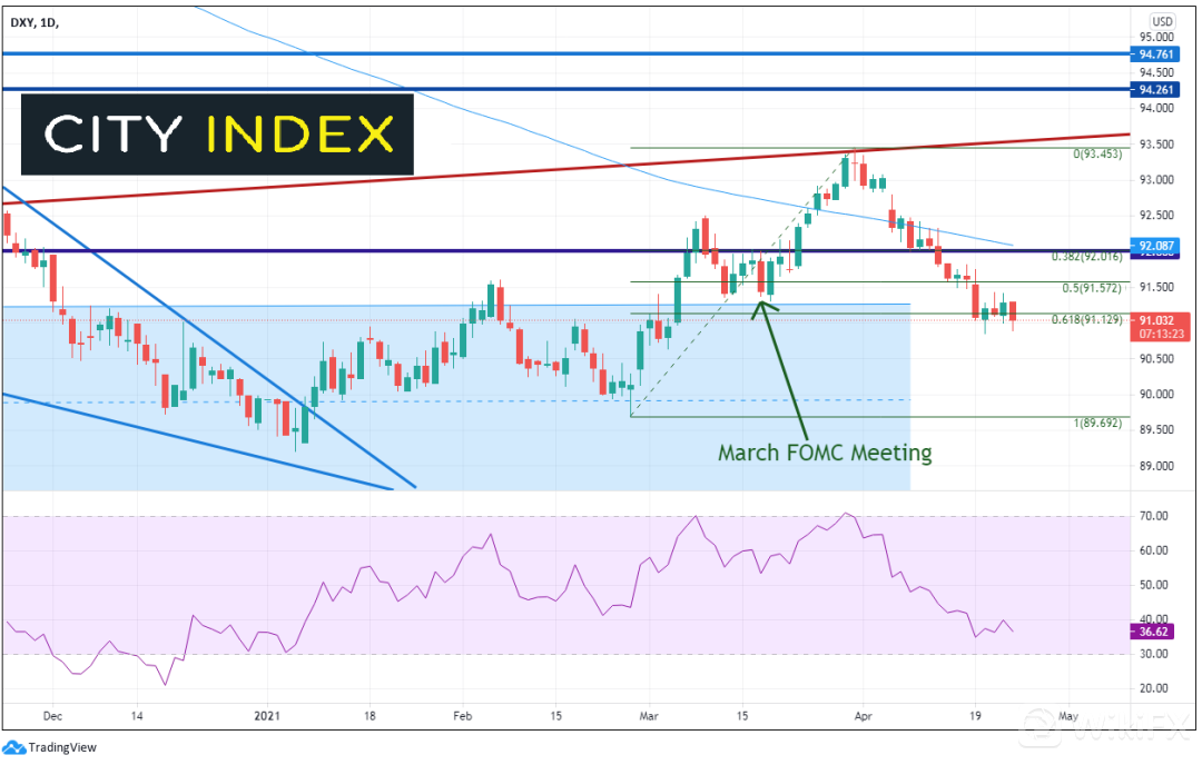 在3月FOMC会议召开前,交易员等待会议结果出炉之际,美元指数暂停上涨。会议当天,美元指数下跌,直到月/季度末才重拾强劲上升趋势。美元指数于3月31日攻入最高点,并已回落至2月25日低点至3月31日高点上行之61.8%斐波拉契回档位91.13附近。与3月会议情况一样,价格走势似乎已于会前稍事停歇。任何缩表暗示都可能推动美元指数走高,而围绕“长期低利率”的讨论或导致美元重回跌势。Forex
