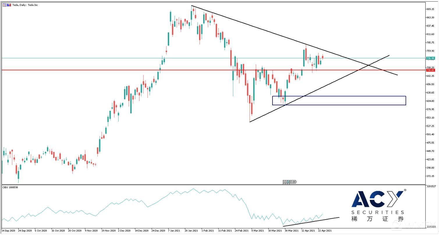 实际上,特斯拉的经营情况并没有表面上那么好。在财报收入中有高达5.18亿美元的碳排放积分销售,如果将这部分收入剔除,特斯拉已经连续第六个季度没有盈利。此外,盈利中还包括了卖出比特币而获得的1亿美元。同时,汽车芯片短缺使其停产了高端车型,特斯拉正在设法寻找新的芯片供应商。不过,ACY稀万证券认为,虽然特斯拉过高的股价、传统车厂的竞争以及最近的维权事件都使其股价承压,但是整体电动车行业的利好以及市场情绪上的偏好仍将提供短线较强的支撑。