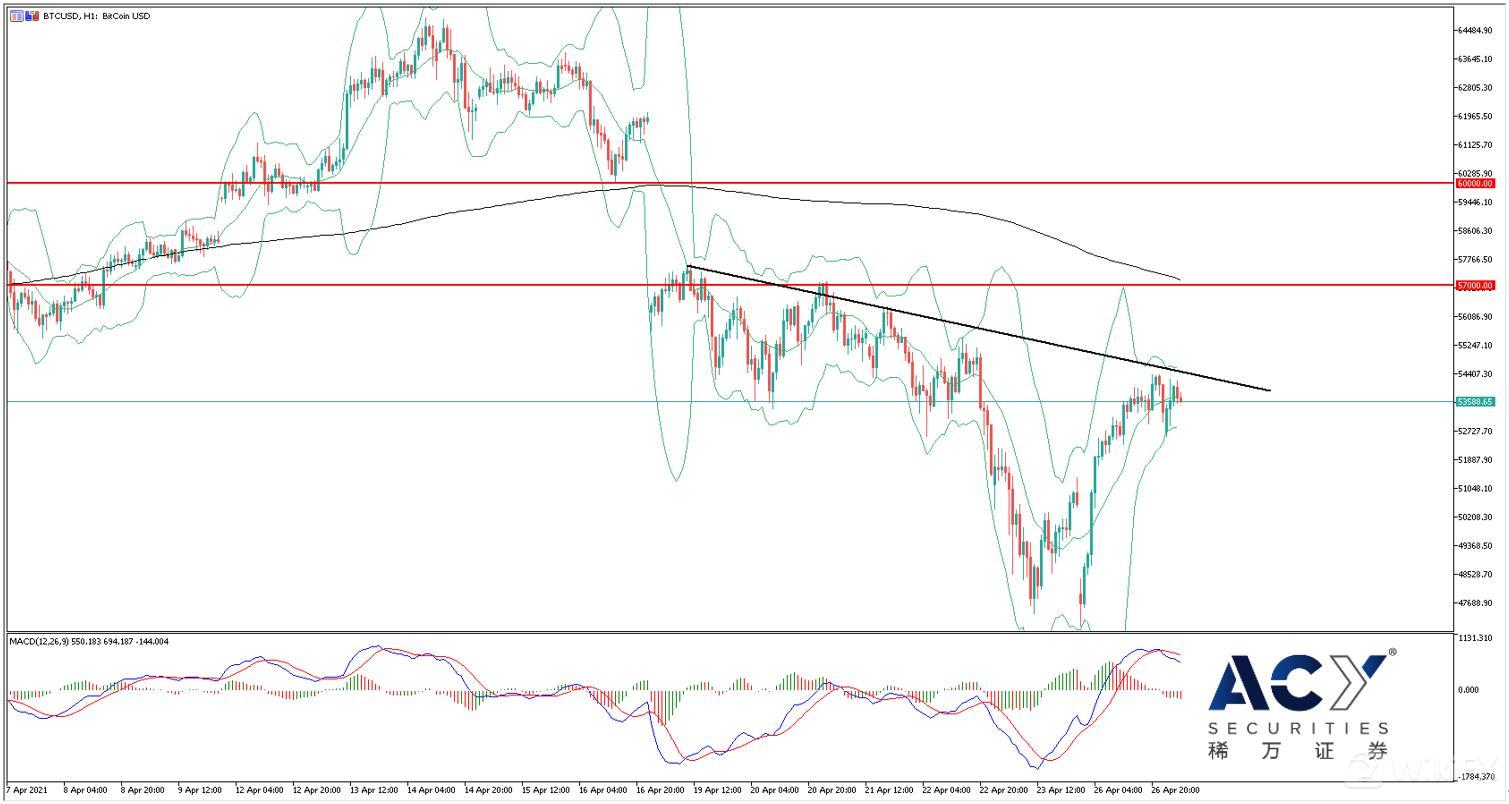 在特斯拉披露出售比特币之后,马斯克随即表示,他没有卖出任何自己持有的比特币,而特斯拉出售比特币的目的是为了证明其流动性。马斯克的发言再次提振的比特币的价格,使其脱离颓势快速反弹,昨日大幅收涨10%。不过,这波上涨的背后很可能是机构拉升出货的现象。从比特币小时图来看,价格连续跳空下跌,233均线已经转向下行,比特币整体呈现空头局势。K线伴随马斯克表态而快速反弹,但是明显受到短线下行趋势的压制。指标方面,布林带开口收敛,MACD形成高位死叉,快慢线转向下行,整体呈现见顶信号。所以在现价位置出现了做空的机会。现价上方的重要阻力在57000-60000的跳空缺口,该位置同时还受到233均线的压制效果。下方的支撑则是48000的价格需求区。