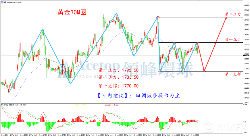 从上图黄金30M周期走势图来看,黄金目前可看做区间震荡走,上轨压力1783.5附近,下轨支撑1770.0附近。震荡走势的突破方向通常顺应原趋势方向,黄金此前为多头上行趋势,后市上破概率较大。结合MACD指标来看,DIFF线与DEA线死叉向下,绿色能量柱逐渐变长,表明空头力量暂时占优,短线可能还有下跌空间,日内操作可等待其下跌至区间下轨1770.0附近尝试多单。