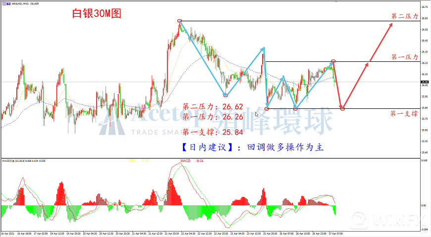 从上图白银30M周期走势图来看,白银经过两波下跌走势后,MACD指标发出背离信号,表明空头力量不足,后市有形成反转的可能。形态上白银两次在25.84附近受到支撑,表明次此位置支撑力度较强,日内多单可重点关注此位置。结合MACD指标来看,DIFF线与DEA线死叉向下,绿色能量柱逐渐变长,表明空头力量暂时占优,短线可能还有下跌空间,日内操作可等待其下跌至25.84附近尝试多单。