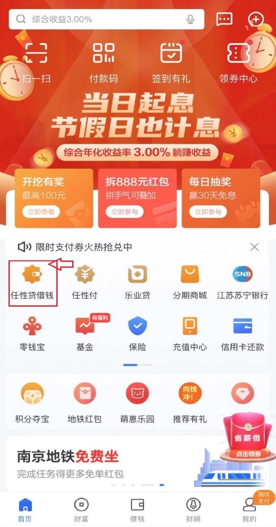 1、苏宁金融APP渠道:苏宁金融APP首页>>任性贷借钱>>点击申请任性贷>>提交资料>>审核通过即可。