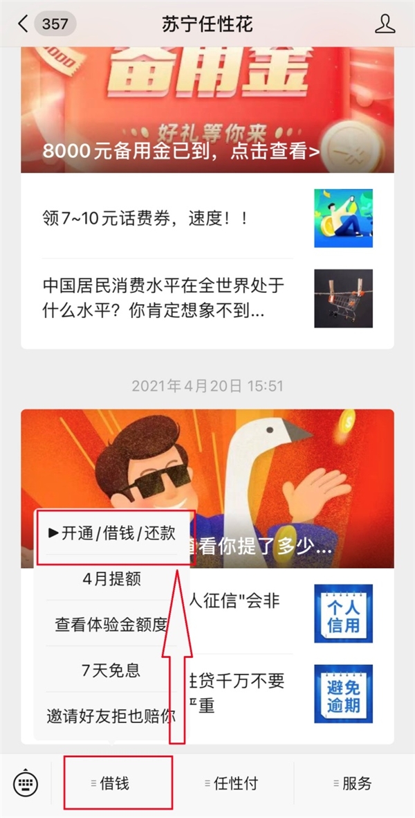 3、苏宁任性花微信公众号:“苏宁任性花”公众号底部菜单>>借钱>>开通/借钱/还款>>点击申请任性贷>>提交资料>>审核通过即可。