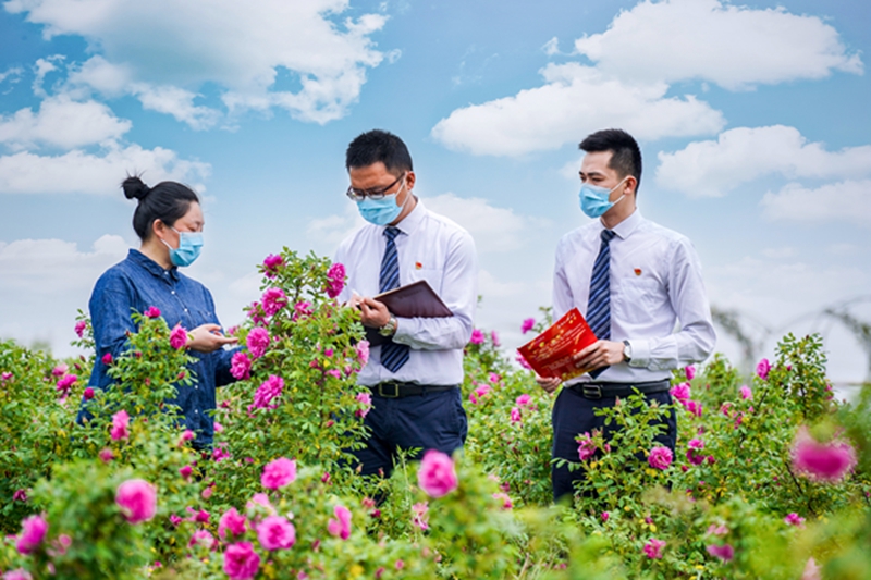 今年以来,浙江农信长兴农商银行在当地监管部门指导下,不断加强对现代农业的支持力度,通过“一对一”的主动上门服务和“金融+合作社+低收入农户”的链式帮扶方式,助力该村形成一条“特色种植+深加工”的玫瑰花产业链,为乡村振兴构筑了一道亮丽风景线。图为该行客户经理在走访泗安镇师姑岗村玫瑰花帮扶基地,了解资金使用情况。 本报记者 刘志良 通讯员 李悦玲 摄