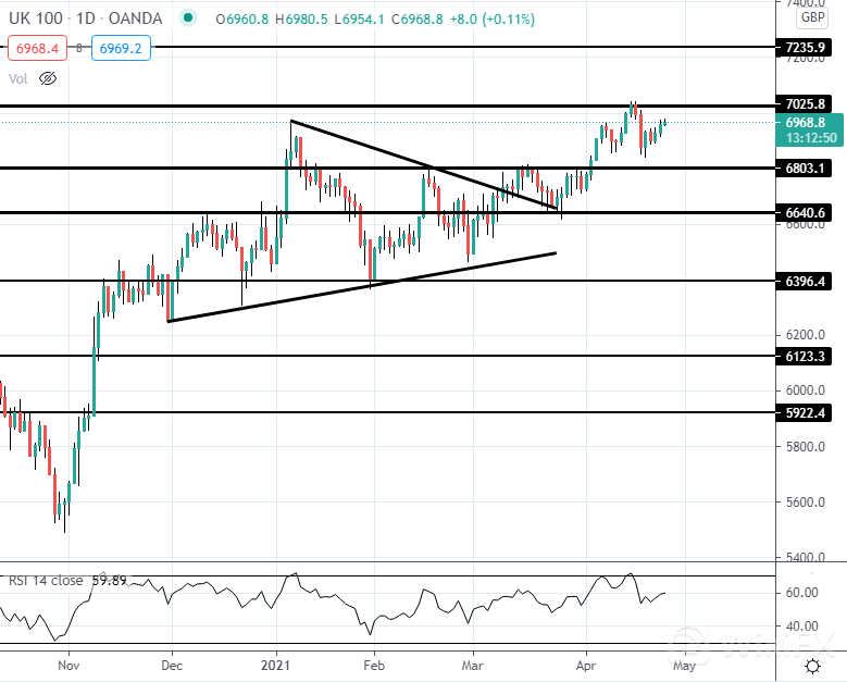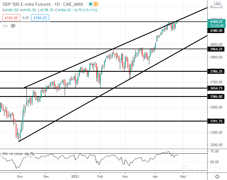 目前,标准普尔指数在4180.50点的阻力位和上升的楔形顶部下方仍处于紧闭状态。动量研究仍然支持这最后一轮上涨,表明反转风险较低。但是,如果我们更正,下一个需要注意的支撑区域将回到3964.25水平,该区域的上升楔也处于低位。