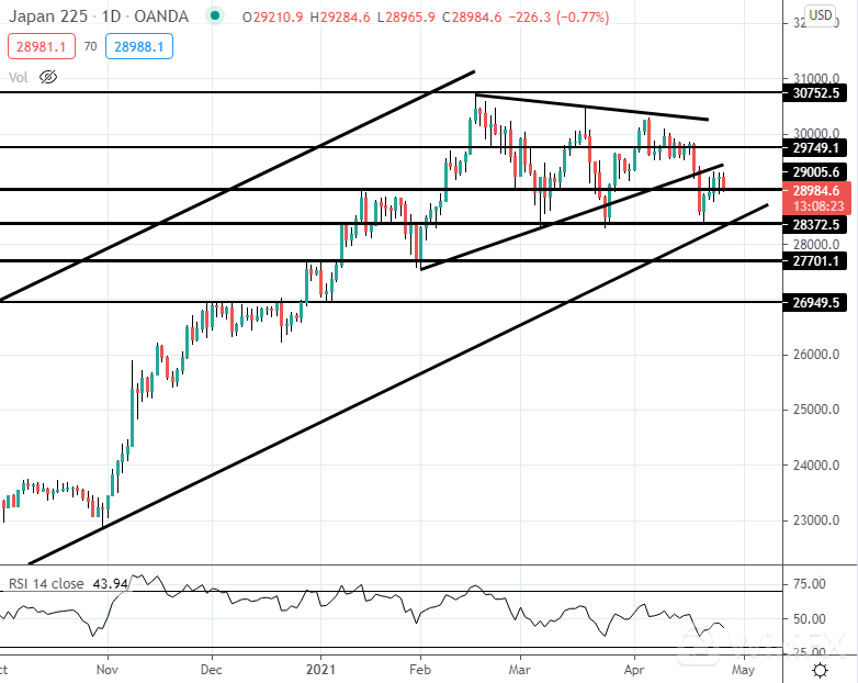 日经指数跌破收缩三角格局,价格从28372.5点支撑位反弹。目前,金价已回落至29005.6点上方,不过正受到破三角格局重新测试的限制。目前,由于价格仍处于长期多头通道内,市场关注的焦点是进一步上行