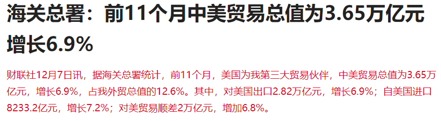 去年12月7日,海关总署发布消息称,前11个月中美贸易总值增长6.9%,对美贸易顺差2万亿元。