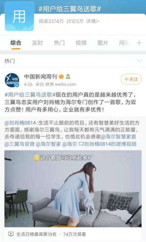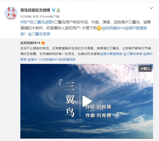 有趣的是,在刘女士将歌曲发布后,海尔智慧家庭官方微博也第一时间做出了回应。 随后,更有青岛媒体以及音乐圈、装修圈等各行业大v也相继关注讨论,目前#用户给三翼鸟送歌#的话题阅读量还在不断提升。截至4月28日10:30,话题阅读量达3374万,《三翼鸟》歌曲视频也有74万次观看。