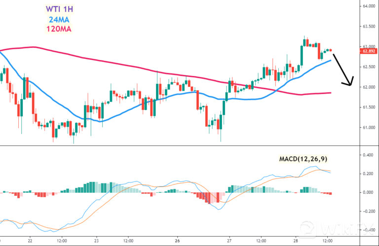 美油(WTI)一小时图 –24MA、120MA及MACD指标