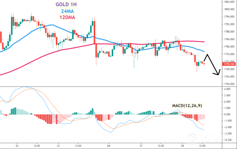观察黄金小时图,短周期24MA及长周期120MA拐下弯,以及MACD维持红柱状体动能,显示短线行情或由空方主导盘势,日内建议以反弹做空为主。