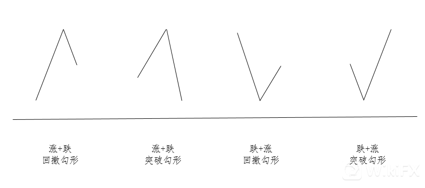 上涨波段+下跌波段(顺序不能变)是多头勾形结构,并且上涨波段的终点要和下跌波段的起点相连。如果上涨波段总幅度(最高点到最低点差值)大于下跌波段总幅度(最高点到最低点差值),则形成回撤勾形,也叫做回调勾形、防守勾形;如果下跌波段的总幅度大于上涨波段总幅度,则形成突破勾形,也叫作进攻勾形。