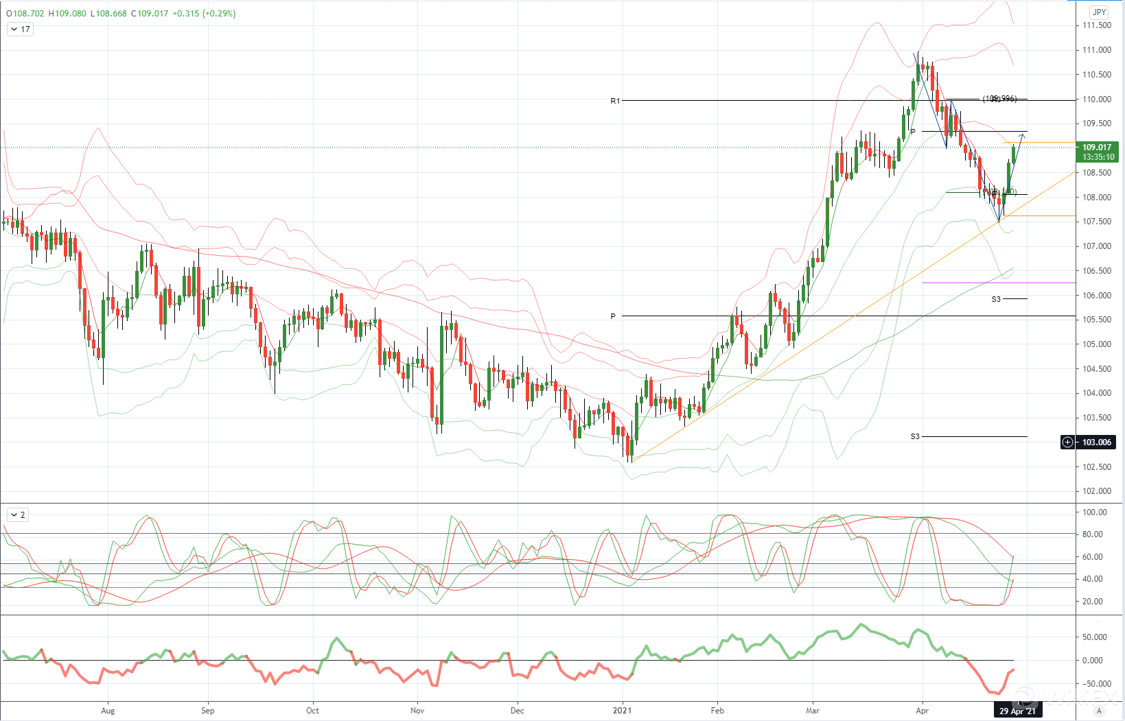USDJPY 从技术和交易角度看,由于107.50作为支撑位,因此有可能测试关键的108.50,通过此处将打开另一视角,看向110。跌破107则将是一个重大的看跌趋势。