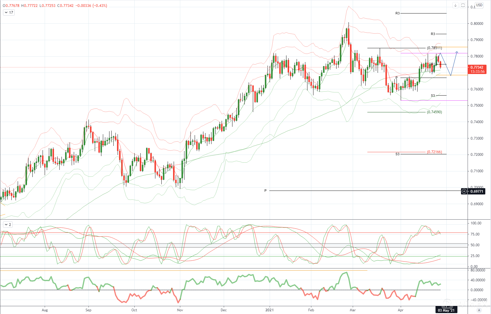 AUDUSD 日内偏差 : 看跌下方.7700看涨上方