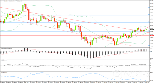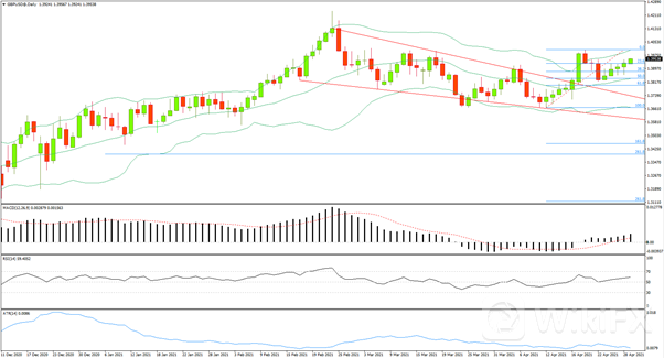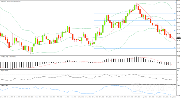 4月28日美元指数跌至逾二个月低位,10年期美国国债收益率在美联储表示政策不变后跌至日内低点,鲍威尔的鸽派发言推动了市场走势。欧元兑美元涨0.04%至1.2091,法国拟从5月开始逐步解封。关于英国首相约翰逊冷血发言的报道以及对爱尔兰协议的分歧令英镑总体形势显得脆弱。高盛表示英国快速推出新冠疫苗意味着其经济增长速度将超过美国,对2021年的预测达到了7.8%,高于其对美国增长7.2%的预期。由于美元和美债收益率受到美联储讲话影响而下跌,金价小幅上涨,站到1780关口,原油价格继续上涨超过1%,根据EIA数据显示美国馏分油库存大幅减少,生产活动加速,提振市场对美国燃料需求上升的期望。