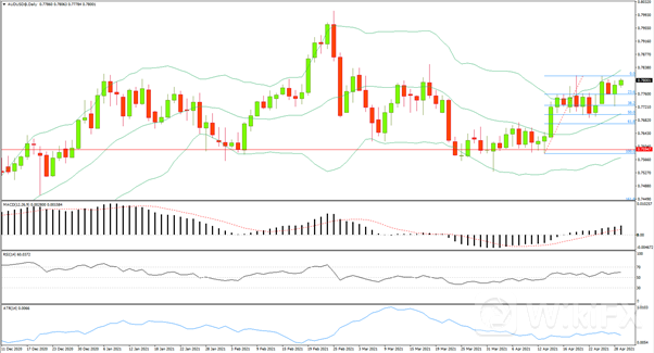 日线级别站稳斐波23.6%回调并收涨,日内曾一度下探斐波38.2%回调位置但被压回,MACD上行动能增强,RSI偏向多方,4小时级别连续上涨,MACD动能重新上涨,RSI临近超买。今日多单在0.7770入场,止损在0.7722,止盈在0.7813