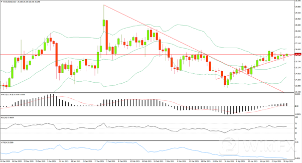 日线级别价格收出第二颗十字星,上探26.25阻力位值被压回,价格同时受到上行趋势线支撑,目前价格正在尝试上探,MACD上行动能增强,RSI偏向多方,预计今日将走出决定后市走势的方向信号。4小时级别下跌后受到25.9位置支撑,MACD翻转回上行动能,RSI向上突破50轴线,今日多单入场位置在26.1附近,止损25.7,止盈在26.45.