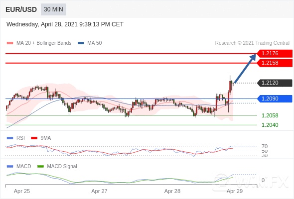 欧元/美元 当日内: 看涨,当 1.2090 为支撑位。 1.2090 作为转折点。 交易策略:看涨,当 1.2090 为支撑位。备选策略:如跌破 1.2090 ,EUR/USD 目标方向定在 1.2058 和 1.2040 。 技术点评 :RSI技术指标大于中性区域50。 MACD技术指标处在其信号线之上 看多。 此外,价位高于其20天及50天移动平均线 ( 分别位于 1.2087 和 1.2082 )。