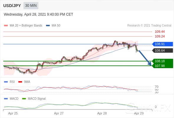 美元/日元 当日内: 看跌,在 108.91 之下。 转折点定在:108.91 交易策略:看跌,在 108.91 之下。备选策略:向上突破 108.91 ,将带来继续上行的趋势,目标位定在 109.24 和 109.44 。 技术点评 :RSI技术指标小于中性区域50。 MACD技术指标处在其信号线之下 看空。 此外,价位低于其20天及50天移动平均线 ( 分别位于 108.85 和 108.85 )。