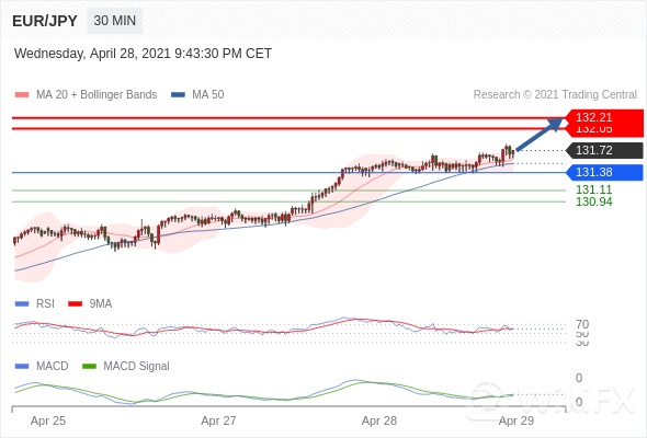 欧元/日元 当日内: 看涨,当 131.38 为支撑位。 转折点定在:131.38 交易策略:看涨,当 131.38 为支撑位。备选策略:向下跌破 131.38 ,将带来继续下跌的趋势,目标位为 131.11 然后为 130.94 。 技术点评 :RSI技术指标大于中性区域50。 MACD技术指标处在其信号线之上 看多。 此外,价位高于其20天及50天移动平均线 ( 分别位于 131.58 和 131.52 )。
