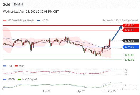 Gold 当日内: 看涨,当 1774.00 为支撑位。 转折点为:1774.00 交易策略:看涨,当 1774.00 为支撑位。 备选策略:如跌破 1774 ,Gold 目标方向定在 1765 和 1760 。 技术点评 :RSI技术指标大于中性区域50。 MACD技术指标处在其信号线之上 看多。 此外,价位高于其20个时期及50个时期移动平均线 ( 分别位于 1772.77 和 1772.26 )。
