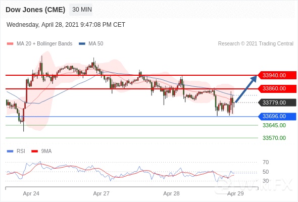 美国道琼斯30指数 (M1)当日内: 谨慎操作。 转折点:33696.00 交易策略:在 33696.00 之上,看涨,目标价位为 33860.00 ,然后为 33940.00 。 备选策略:在 33696.00 下,看空,目标价位定在 33645.00 ,然后为 33570.00。 技术点评:RSI技术指标运行趋势复杂,倾向于上涨。