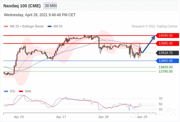 美国纳斯达克100指数期货 (M1)当日内: 没有明显变化趋势。转折点:13865.00 交易策略:在 13865.00 之上,看涨,目标价位为 13985.00 ,然后为 14040.00 。 备选策略:在 13865.00 下,看空,目标价位定在 13820.00 ,然后为 13790.00。 技术点评:RSI技术指标运行趋势复杂,倾向于上涨。
