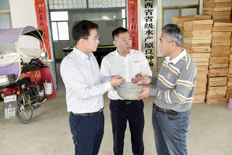 近年来,江西南丰农商银行充分发挥县域金融主力军作用,聚焦当地特色产业,全力扶持广大村民发展龟鳖养殖产业,促进农民増收,助力乡村振兴。自2020年以来,该行累计发放龟鳖产业类贷款947户、金额达4.56亿元。图为该行客户经理在贷款户蔚晓阳的甲鱼基地了解生产及贷款使用情况。 本报记者 刘志良 摄