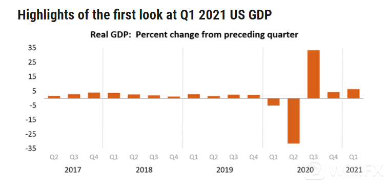 周四20:30,美国公布第一季度实际GDP年化季率初值,数据录得6.4%,远超前值的4.5%,也高于预期值的6.1%。同时公布的美国至4月24日当周初请失业金人数录得55.3万,比预期和前值略高;美国第一季度实际个人消费支出季率初值录得10.7%,为去年第三季度以来新高,也高于预期的10.5%。