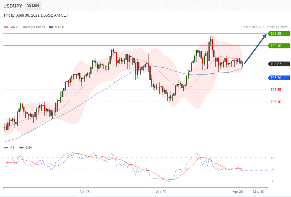 交易策略:在108.70之上,看涨,目标价位为109.10,然后为109.25。