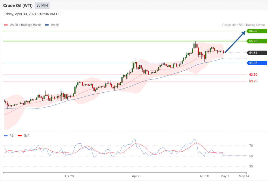 交易策略:在64.25之上,看涨,目标价位为65.45,然后为66.00。