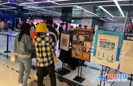 5月2日下午,在恒业影城北京IMAX店(北京银座和谐广场购物中心店) ,观众排队进行防疫登记扫码。中新经纬 张猛 摄