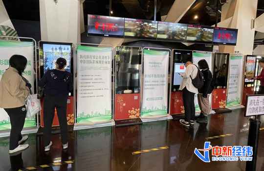 5月1日,在中影国际影城(千禧街店) ,观众在自助取票机取票。中新经纬 张猛 摄