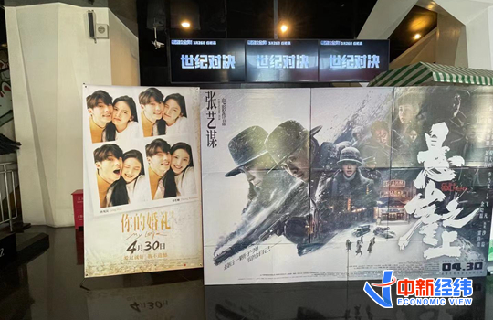 中影国际影城(千禧街店) 店摆放的《悬崖之上》《你的婚礼》电影海报。中新经纬 张猛 摄