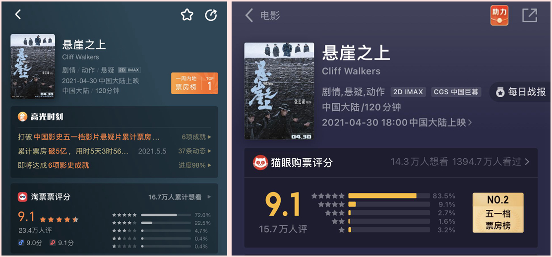 《悬崖之上》在淘票票猫眼和上评分9.1分。来源:灯塔、猫眼专业版APP