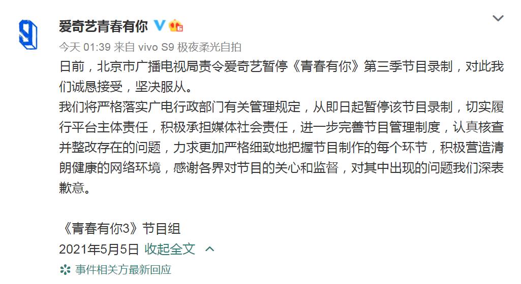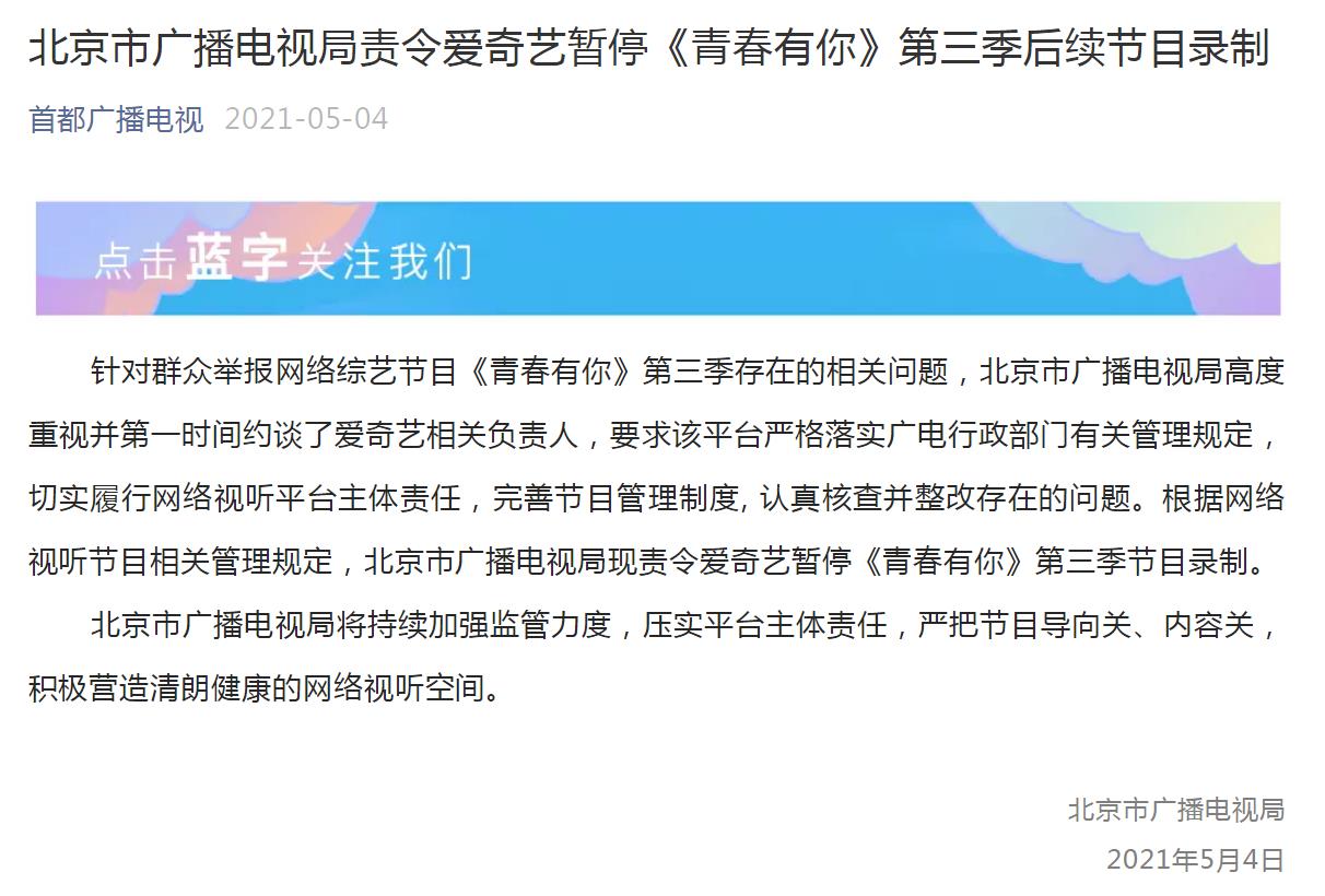 5月4日,北京市广播电视局官方微信发文,责令爱奇艺暂停《青春有你》第三季后续节目录制。