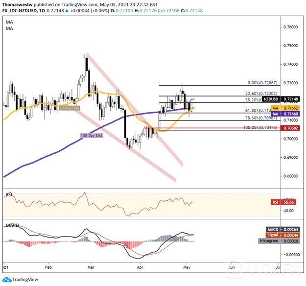 不过,本周与市场情绪相关的最重要的市场事件,也就是与澳元和新西兰元相关的,将是美国的非农就业报告。DailyFX经济日历显示,市场普遍预测4月份就业人数将超过97.8万。此外,日本央行(BoJ)将于今天公布其货币政策会议纪要。