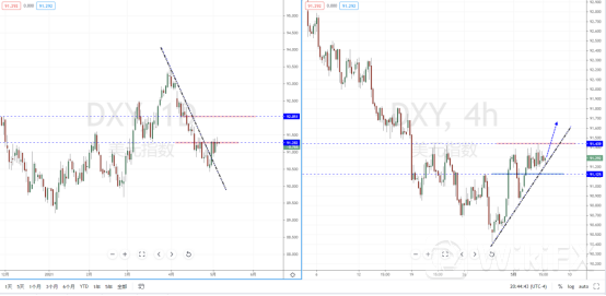 美元指数天图:短期价格在测试前期低点附近后转势起稳上行,并且有效突破下降趋势线的压制作用。现阶段属于偏多节奏,也属于转势初期。上方有关键的压制作用在91.282附近,从日内4小时级别,其价格也在此区间内徘徊,可适当关注趋势调整后上行突破的多头机会,上方区间目标位置可参考92.051一带。