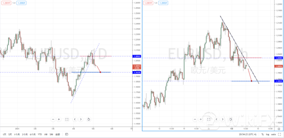 欧美天图:目前行情随着美元指数的转势,欧美也在关键位置转势下行,并且形成头部状态。也有效跌破上升趋势线与水平支撑带1.20925附近,且属于空头方向。从日内4小时级别,价格随着下降趋势线的压制作用继续下行,可适当关注其趋势短期回测上方压制后再次走弱的空头机会,下方目标位置参考1.19539附近。