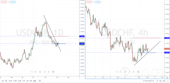 美瑞天图:目前行情在继续下行后转势上行,并且价格短期有突破下降趋势线的压制作用。现阶段趋势筑底已经成,但需要进一步确认。从日内4小时级别,价格在有效突破水平支撑带0.91221附近后趋势表现相对比较反复。可适当关注价格再次有效测试多重支撑区域的表现。如测试有效,上方目标位置可参考0.91818附近。