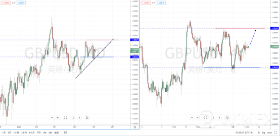 镑美天图:目前整体行情虽然处于偏多阶段中,下方有上升趋势线的支撑作用,其水平支撑带在1.38325附近。从日内4小时级别,其趋势一直处于在宽幅区间内调整,虽然价格表现比较极端,但依然在下方关键支撑带1.38249附近起稳上行。短期可适当关注价格调整后的多头机会,上方目标位置参考1.39782附近。