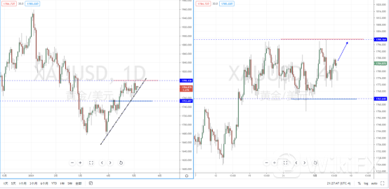 黄金天图:目前趋势虽然处于多头阶段中,但上方空间幅度有限,并且价格一直处于窄幅区间内调整。下方水平支撑带在1753.607附近,同时又有上升趋势线的支撑作用。从日内4小时级别,整体格局则继续在宽幅区间内调整运行,可适当关注价格调整后上行的多头机会,目标位置参考1799.164附近。