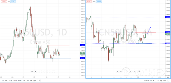 A50指数天图:目前行情在相对底部区间徘徊,整体趋势继续处于调整之中。下方水平支撑带在16846.9附近,上方水平压制带在17785.5附近。从日内4小时级别,价格在冲击上方短期压制带后承压,可适当关注价格再次调整后上行的多头机会,其目标位置可参考高点附近。