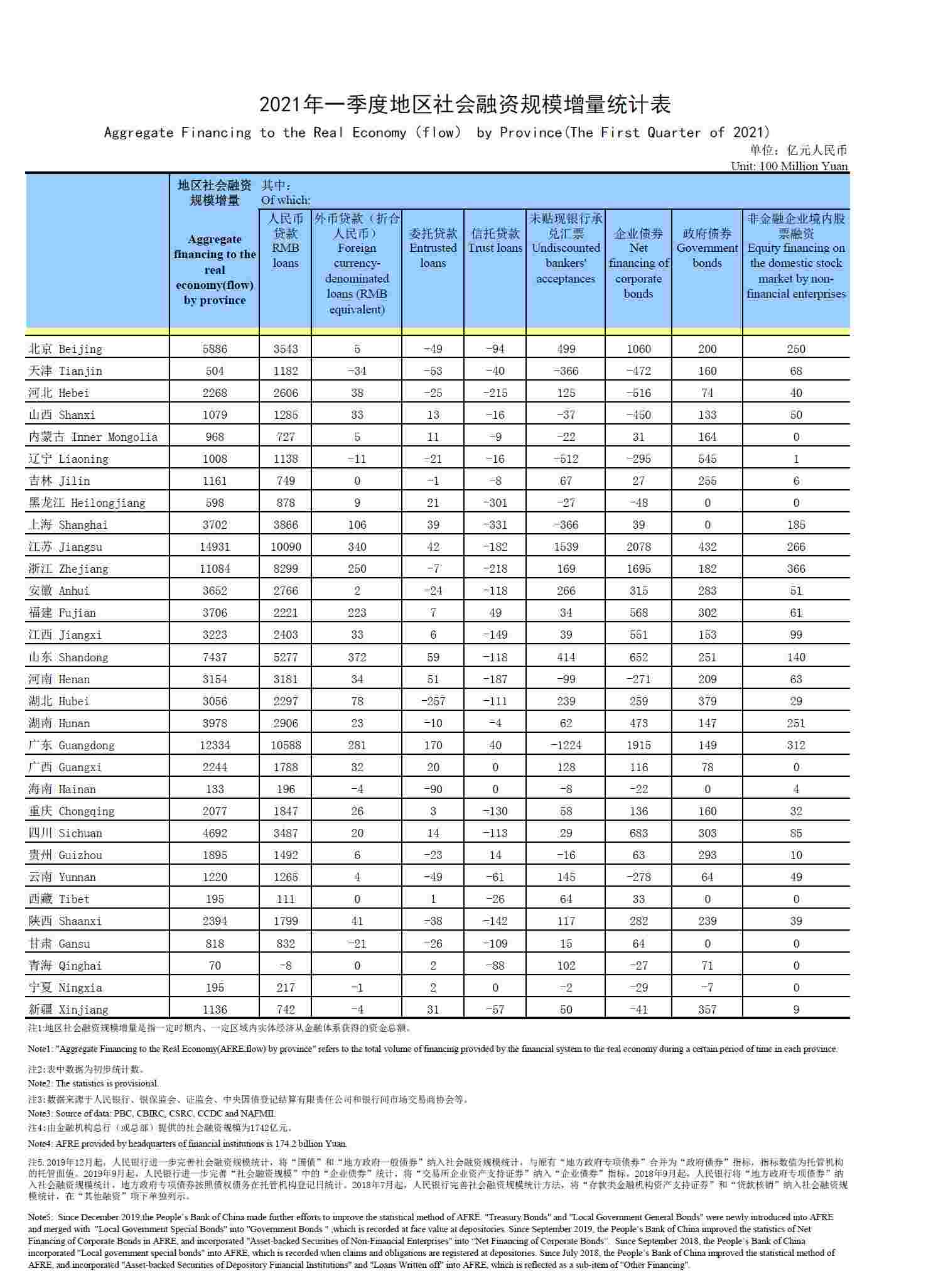 央行网站6日公布2021年一季度地区社会融资规模增量统计表显示,江苏、广东、浙江居前三甲。