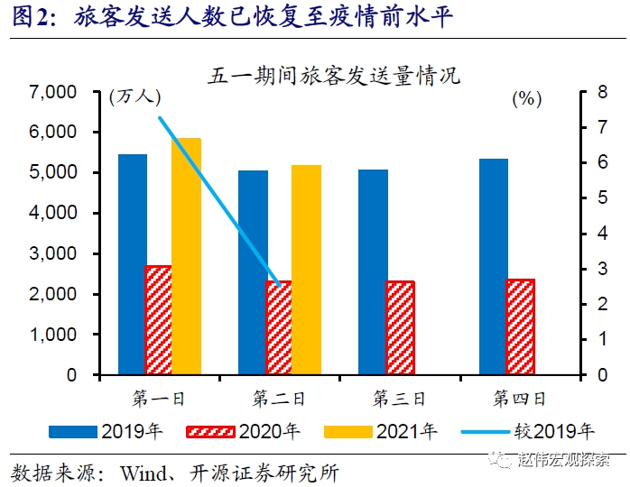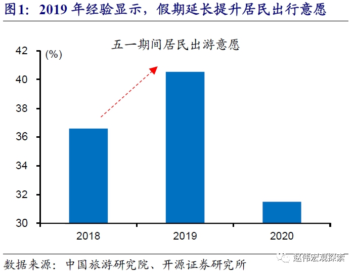 五一假期的延长,有利于提升居民出行意愿和提振消费。2019年以来,五一假期天数延长,从2018年的3天延长至2019年的4天,2020年疫情后进一步延长至5天,2021年维持5天假期。2019年经验显示,假期延长后,居民出行意愿明显上升;2020年五一国内疫情刚平复,假期延长的影响并没有明显体现;2021年五一维持5天长假,对居民出行意愿和消费的提振或较为明显。