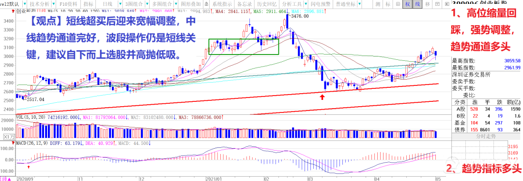 五一长假后的首个交易日,疫苗、白酒、医药等行业龙头大跌直接带崩了创业板指数,旅游酒店则直接见光死开盘大跌,桂林旅游跌停,黄山旅游爆跌9%;而沪市主板相对较强的原因更多来自于钢铁、煤炭、有色等传统周期板块的走强,另外部分汽车股如小康 股份、北汽 蓝谷冲击涨停,市场题材炒作分化明显;午后两市虽有小幅企稳回升,但成交量明显萎缩,主力做多意愿不强。