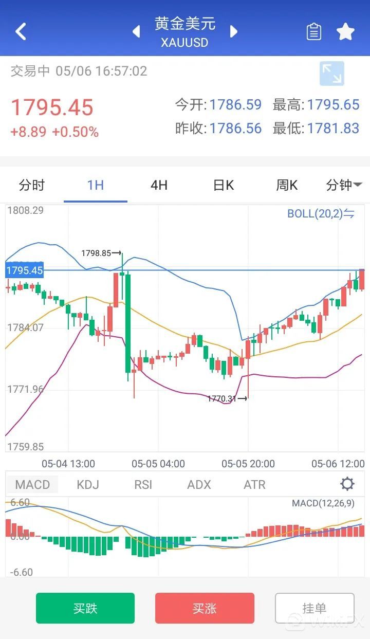 周三,现货黄金维持盘整,亚盘和欧盘初波动不大,晚间小非农数据公布后,现货黄金短线下挫、险破1770美元关口,但美盘开盘后震荡走高并转涨,最终收于日高附近,报1786.56美元/盎司。本交易日,现货黄金价格继续反弹,因美元指数早盘冲高后回落,未能升破上日录得的4月19日以来高点91.436。投资人等待本周稍晚将公布的美国4月非农就业报告。