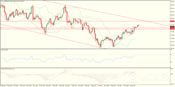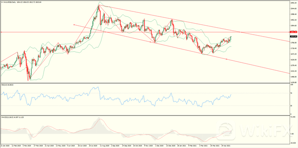现货黄金日线级别大幅收涨,强势上破周线布林带中轨,阻力上移且上方重要阻力位于1828一带——周线级别斐波那契38.2%水平位,预计今日企稳后将持续上冲动能,那么四小时级别1818一带区域将是汇价的第一阻力,NACD上行动能强劲,但警惕RSI已运行于超买区域,警惕金价欧盘走出一波冲高回落行情。但在前几个交易日已提示过大家,破位1802证明确金价这一波的月线级别调整还没有结束,但需要注意的是日线级别黄金仍然运行在完整的下降通道内,到位之后还是空头策略。建议昨日的一波大幅拉升,多头势能还比较强势,今日操作策略上以回调做多为主。